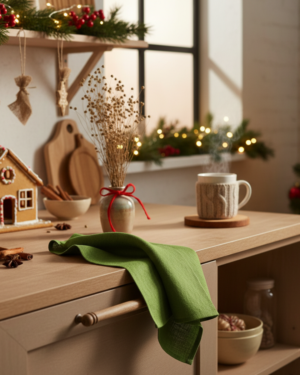 Ge bort den mysiga julstämningen med vår gröna 100% linne kökshandduk. Omsorgsfullt tillverkad av hållbart, restfritt linne, är denna diskhandduk en present som förenar tidlös stil med miljövänligt leverne. Mjuk, slitstark och vackert texturerad, ger denna festliga handduk en varm, naturlig charm till vilket kök som helst. Perfekt för att slå in hembakade kakor, kombinera med ljus eller lägga till i en hjärtlig julkorg – linnehandduken är en liten detalj som känns underbart personlig. Den rika gröna nyansen känns som julen själv. varm, glädjefylld och skapad för att delas år efter år.