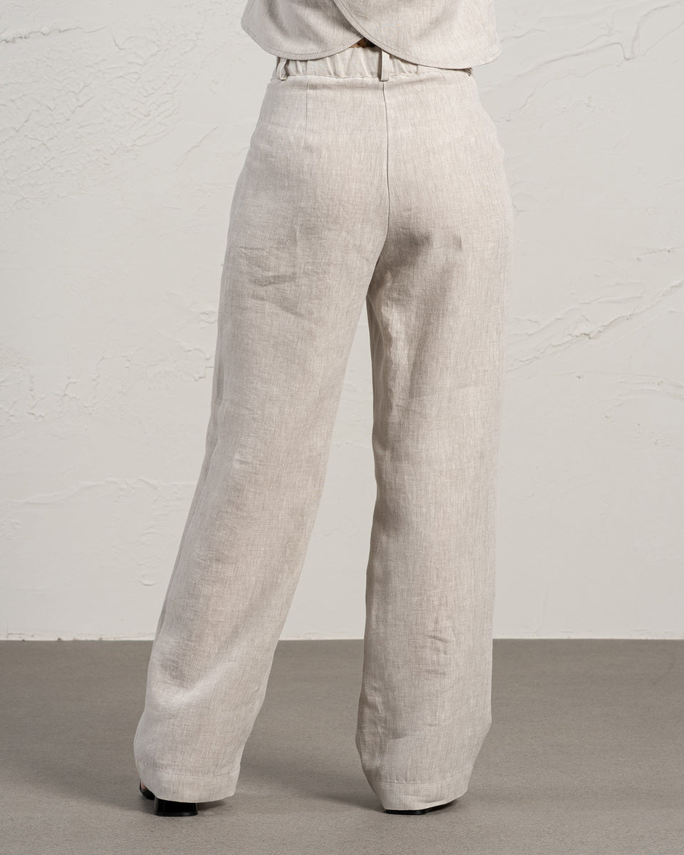 Linnebyxan Lotus med hög drapering, tillverkad av 100 % miljövänligt och hypoallergent linnetyg. Damens plisserade byxor har en klassisk vida ben-design som omfamnar din figur och definierar midjan med ett elastiskt midjeband baktill. Linnebyxorna har två sidofickor, en snäckknapp, dragkedja och bälteshällor.
