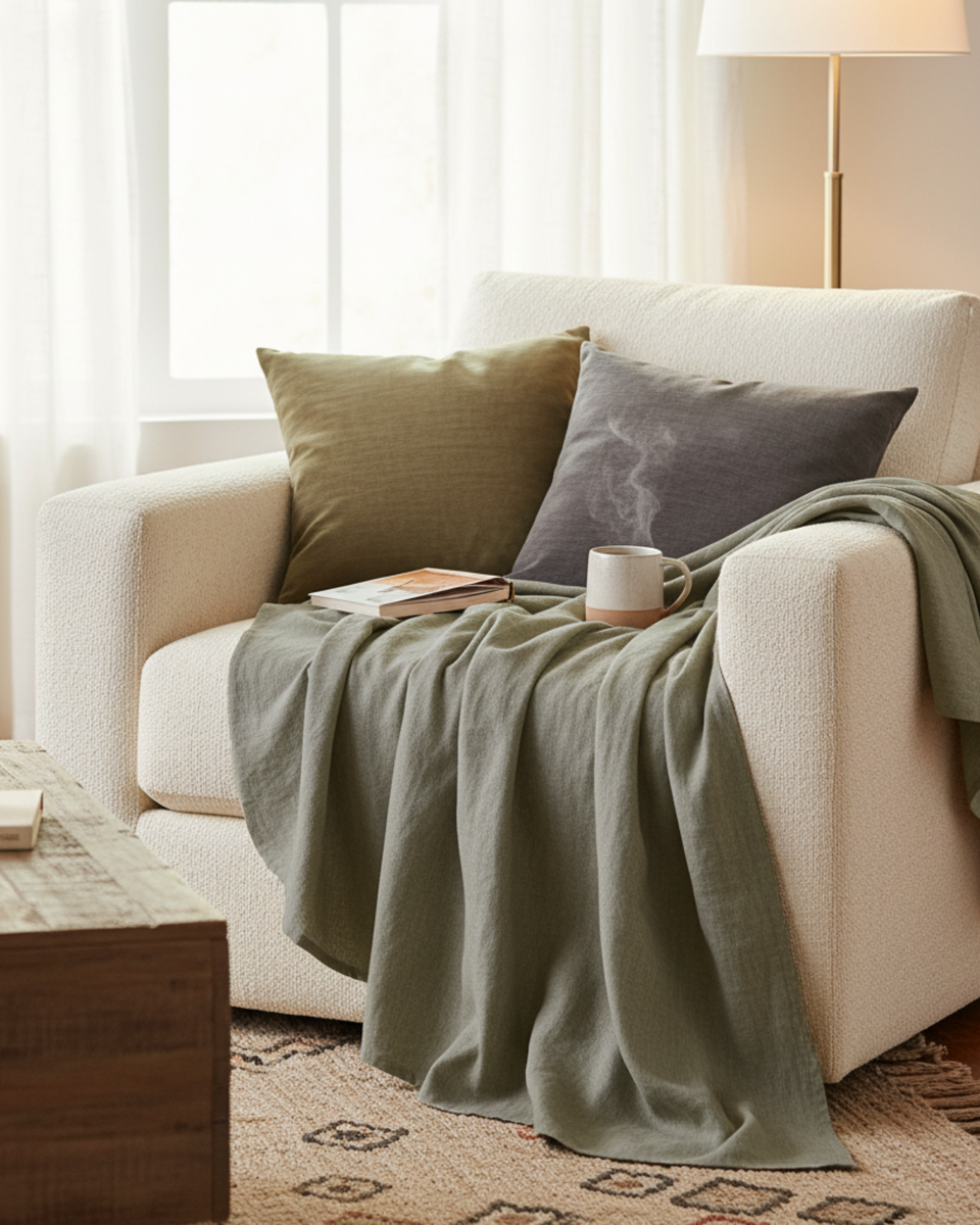 Förbättra ditt hemkomfort med vår pläd i linne. Tillverkad av 100 % ekologiskt linne är vår pläd din perfekta lösning för komfort året runt. Oavsett om det är en kylig vinterkväll eller en svalkande sommarkväll, har vår luftiga linnepläd dig täckt. Linnets naturliga andningsförmåga säkerställer att du håller dig bekväm utan att känna dig för varm eller för kall. Dess mjuka, lyxiga textur är skonsam mot din hud, vilket gör den perfekt för att krypa upp med en kopp te, lägga till ett extra lager på din säng eller förbättra din soffas estetik.