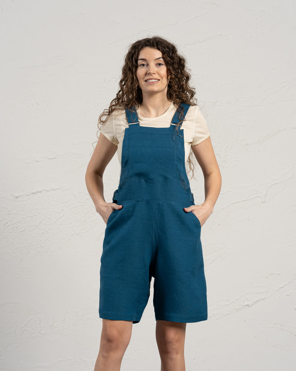 Made from 100% European linen, this classic pinafore romper offers comfort and freedom of movement. It comes with two side pockets, a front pouch pocket, and two back pockets to hold your essentials. The adjustable straps ensure a perfect fit, making this short jumpsuit the perfect choice for casual occasions.