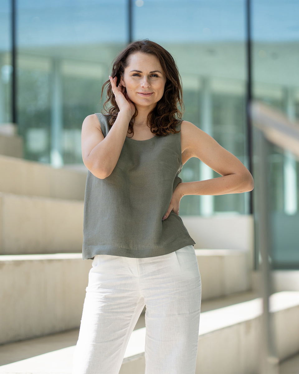 Hana tank top is a breezy summer blouse crafted from hypoallergenic and organic 100% Linen fabric which is known to be extremely breathable, moisture-wicking, and safe even on the most delicate skin. Linen tank features a round neck, relaxed silhouette, and straight cut. With small splits on both sides, linen top is the perfect partner to our high-waisted linen pants Dakota or skirt Sophia.