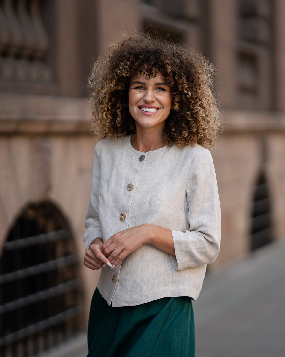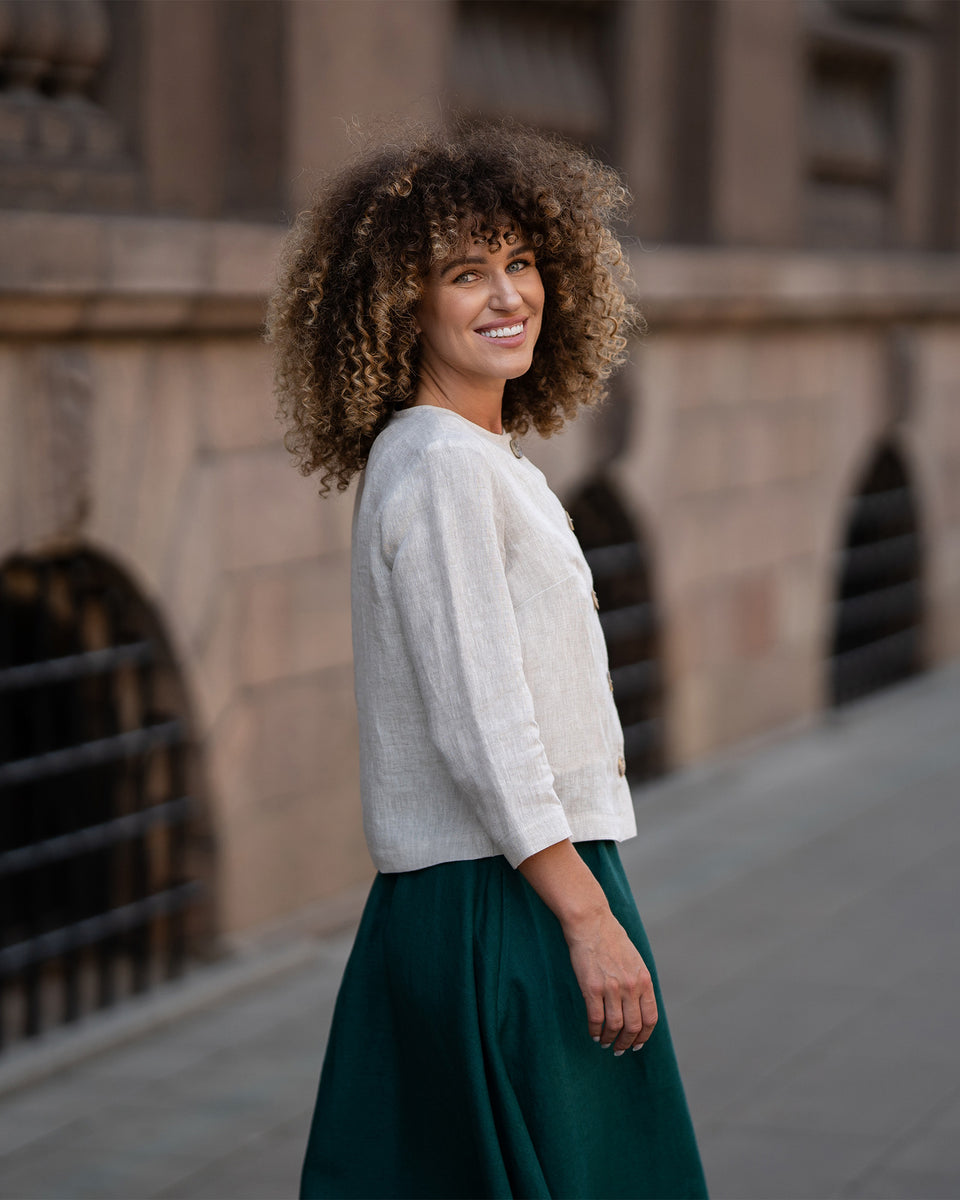 Add a touch of effortless elegance to your everyday wardrobe with our Linen cardigan Alice. Made from 100% breathable, lightweight, premium Linen, this cropped cardigan offers unmatched comfort while keeping you effortlessly stylish throughout the year. Designed with a classic round neckline and elegant 3/4-length sleeves, this Linen bolero jacket flatters the silhouette while adding a feminine touch to both casual and dressy looks. The button-front closure enhances its tailored look, making it ideal for layering over dresses or blouses. Whether you're heading to the office, enjoying a weekend brunch, or attending a garden party, this women’s Linen blazer-style cardigan is your perfect companion!