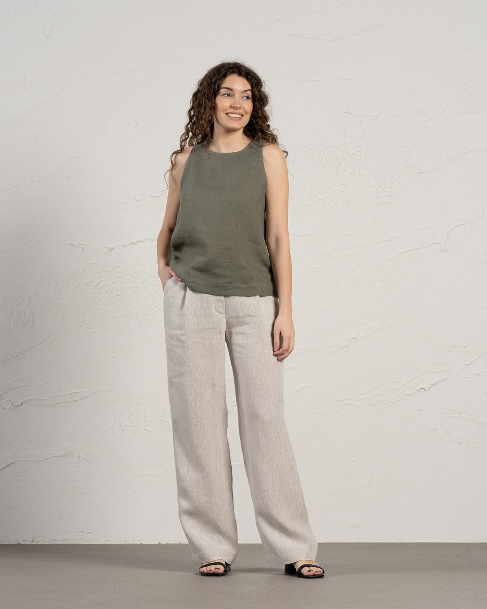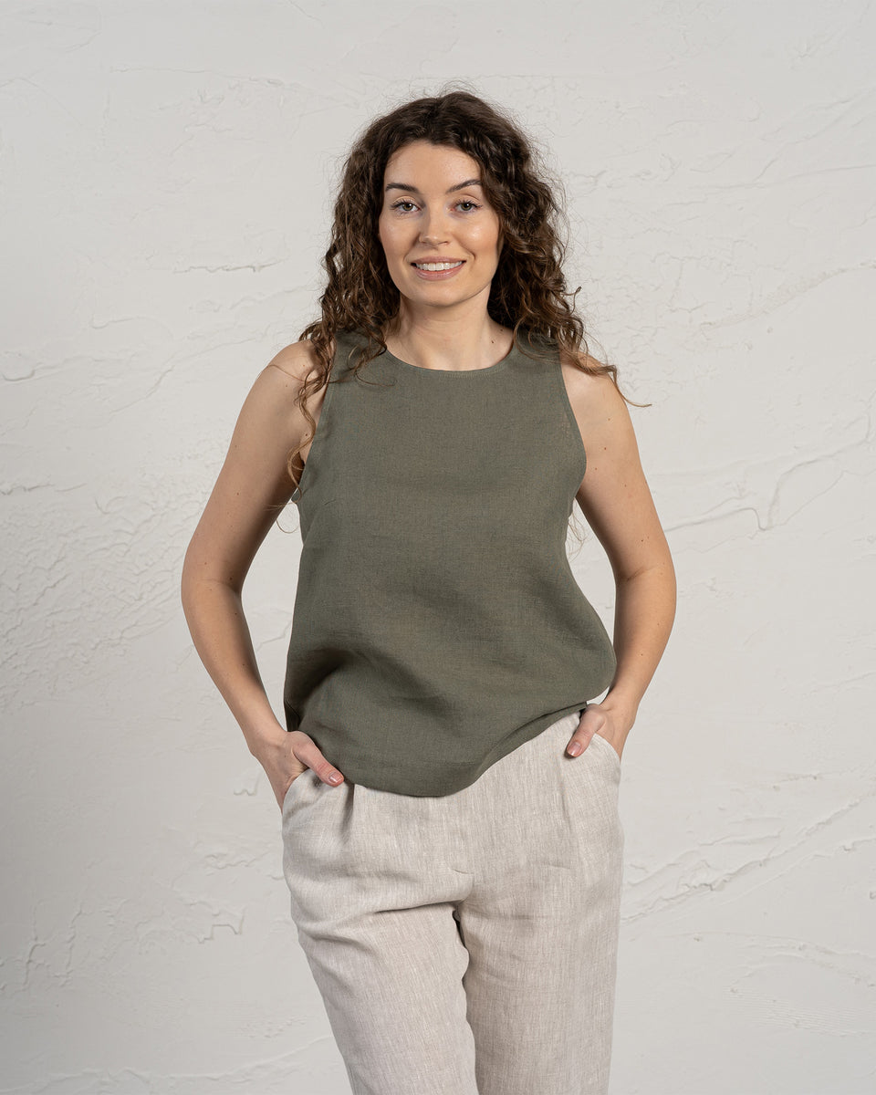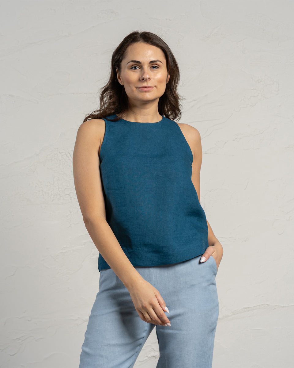 100% Linen vest top, with a high neckline elegantly fastening at the back with a single button for a secure fit, comes in a regular length. Versatile and stylish Linen blouse can easily be paired with pants or skirts.