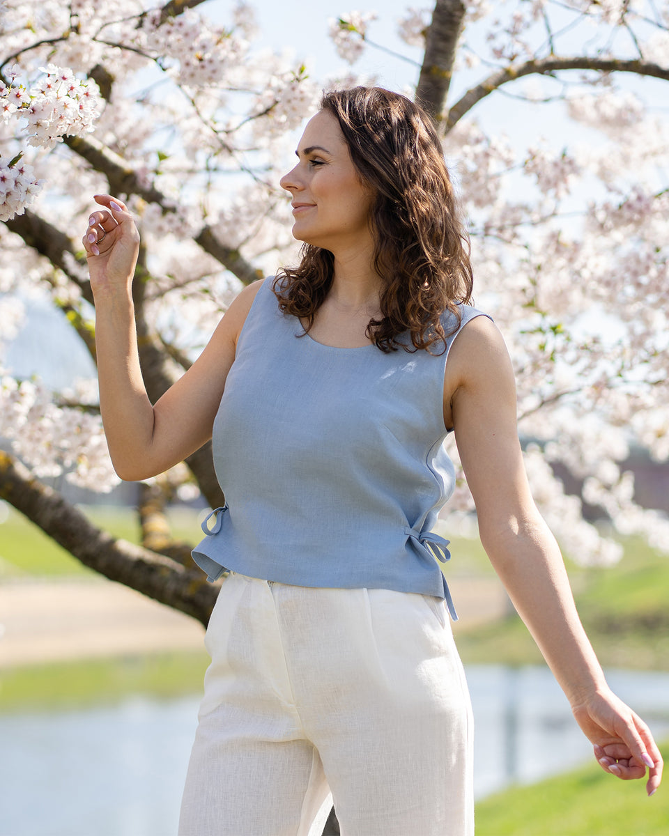 Get ready for a summer brimming with excitement with our Linen bow side tie top Audrey. Made from 100% high-quality linen, our crop top blouse showcases delicate side straps that tie into graceful ribbons, bringing an elegant touch to your summer look. Effortlessly pair this sustainable, sleeveless top with pleated pants, trousers, or shorts, and you are ready for adventures.