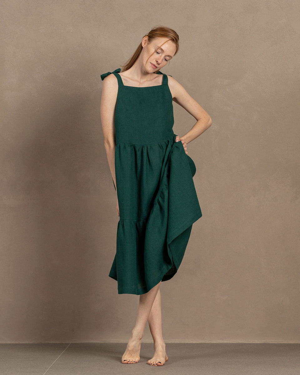 Sleeveless pinafore dress designed with adjustable straps for a personalized fit. Our 100% Linen dress features a square neck, loose-fitting silhouette, drop waist style, and midi length, and subtle chest darts that enhance shaping around the bust area. Uma offers a relaxed yet dreamy look.