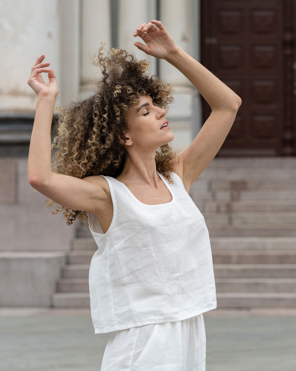 Two-piece set is made from 100% Linen, which is not only sustainable and organic but also incredibly soft and breathable. The Ana crop top blouse and Dakota trousers are designed to keep you comfortable all day long.