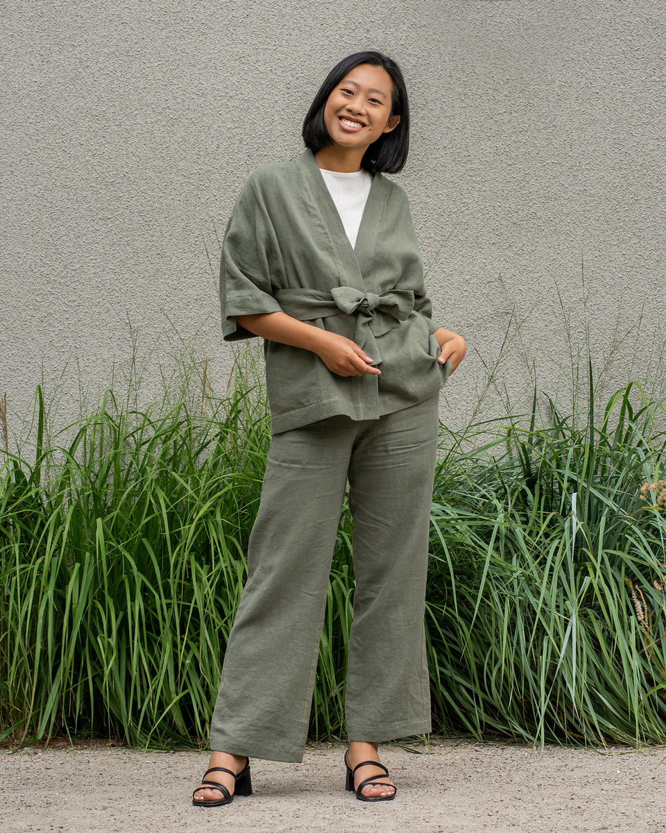 Loose, comfy silhouette with kimono-inspired sleeves or wrap design.