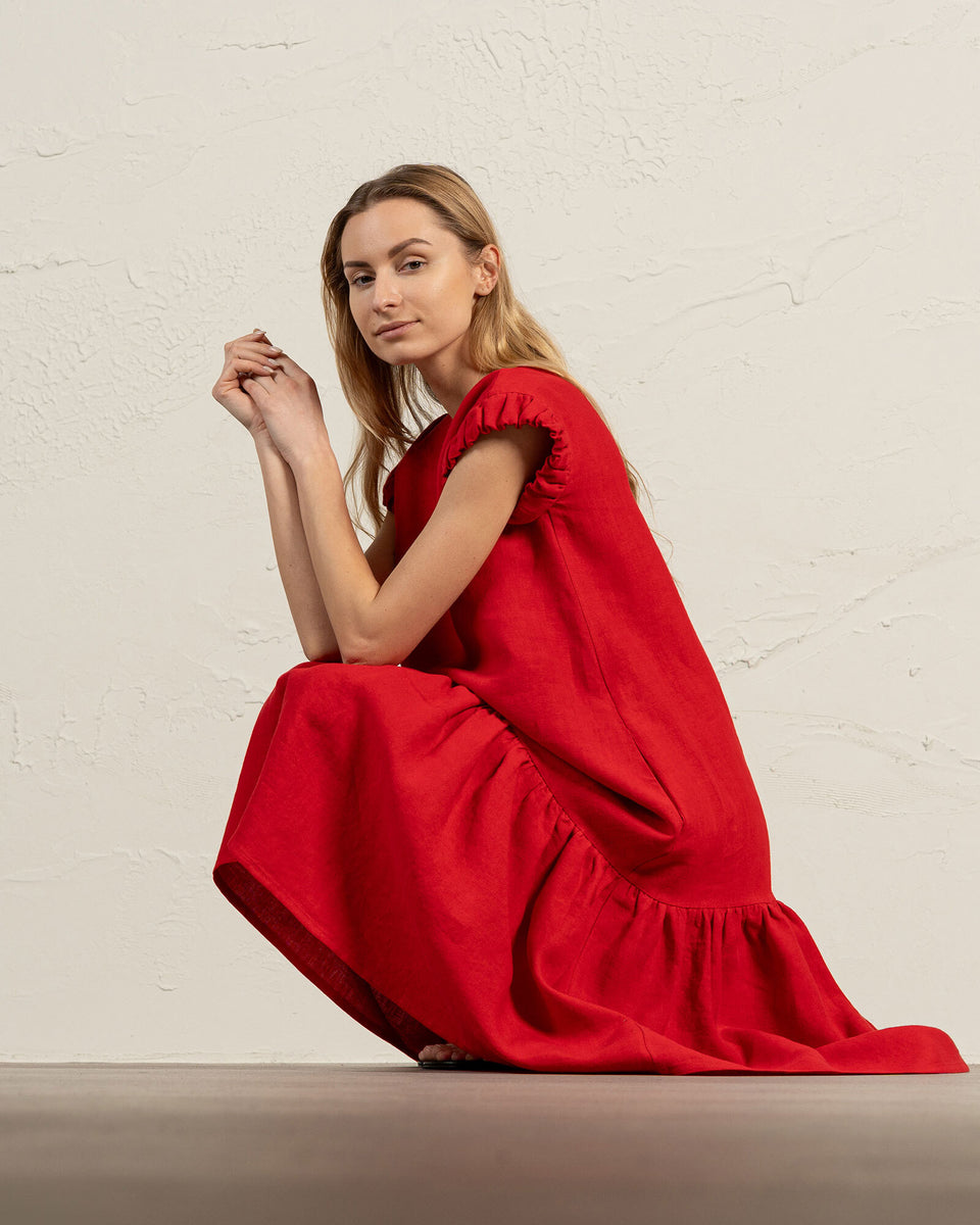 Linen dress Victoria features an feminine silhouette with elegant ruffles on the sleeves and bottom, offering a flattering look. The women's dress is crafted from breathable 100% Linen fabric, ensuring comfort throughout the day.