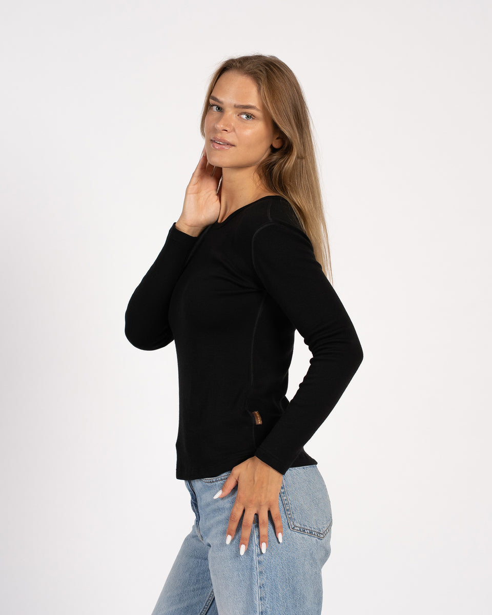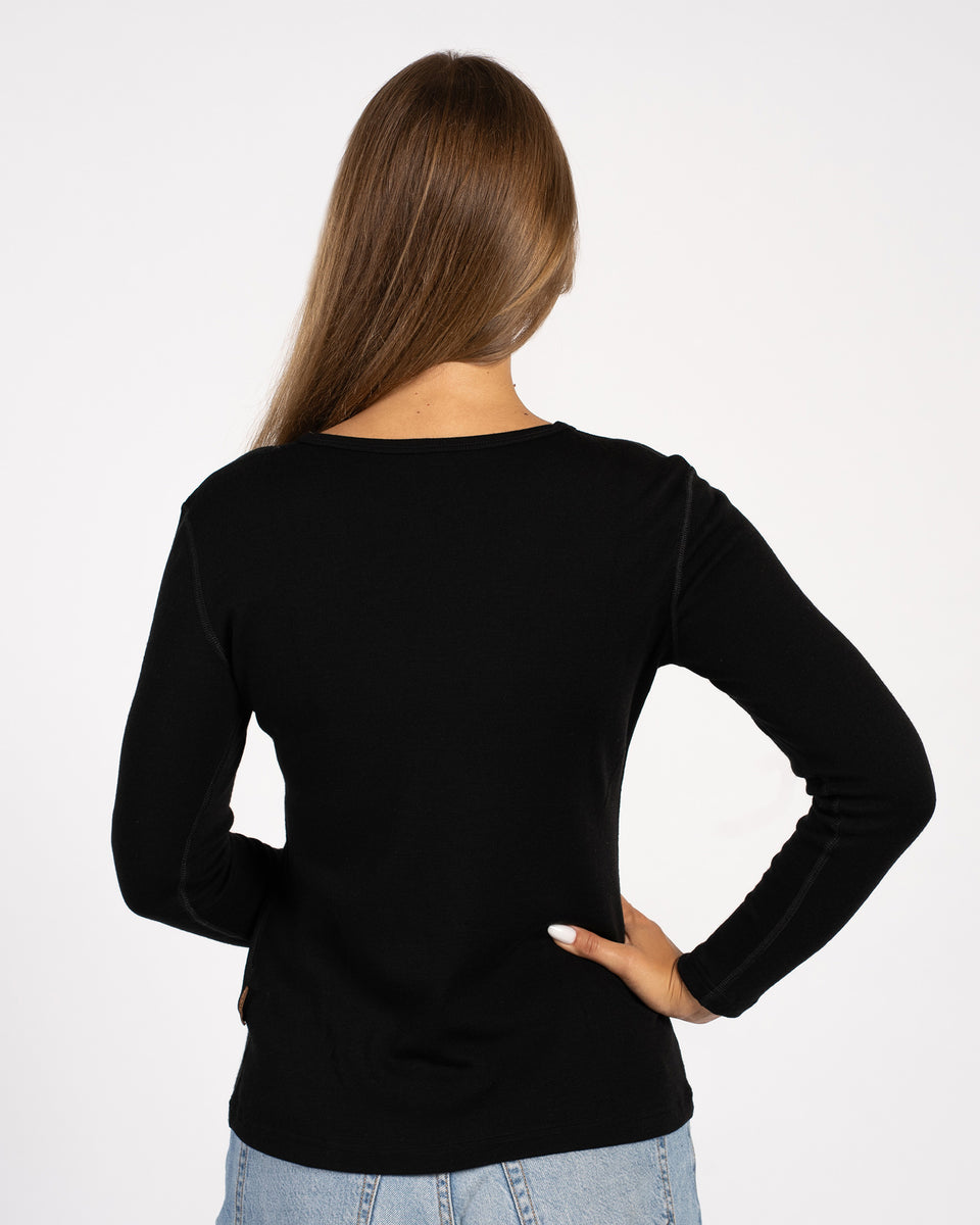 Crafted from midweight 100% pure Merino wool, the women's long sleeve crew is not only comfortable and functional but also stylish enough for any occasion, whether you're at the gym or on the go. The classic black design is elegant and flattering, making it a versatile piece that transitions effortlessly from day to night and from the city to the mountains. This soft-to-touch top pairs perfectly with skinny jeans or flats for a fashionable city look, while its antibacterial, odor-resistant, and breathable properties ensure you stay clean, scent-free, and comfortable in any climate, making it an essential addition to your wardrobe.