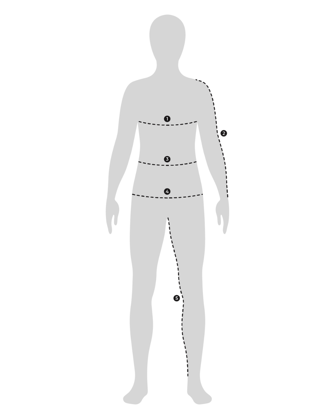 1. Bröst/Byst: Mät under armarna vid den fylligaste delen av ditt bröst. Håll måttbandet i nivå med golvet.