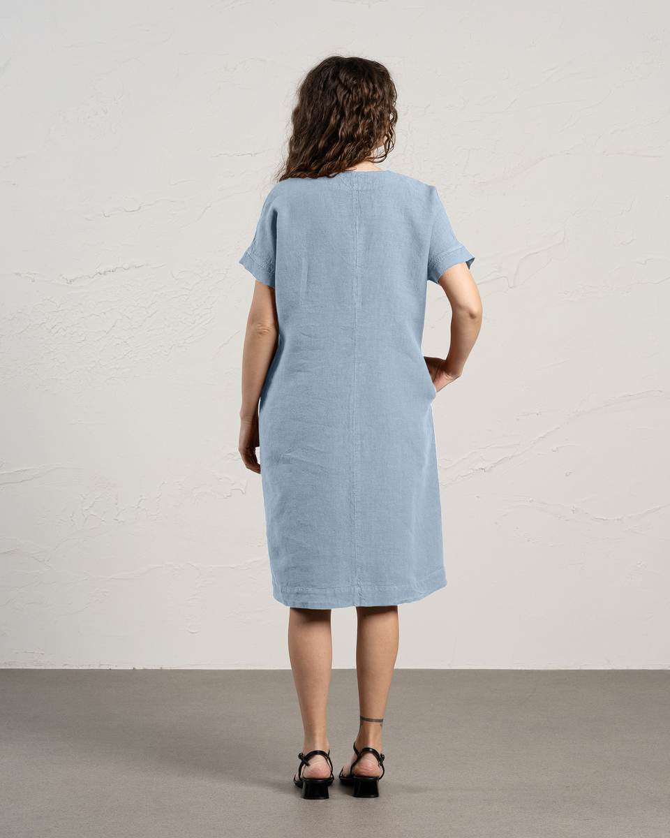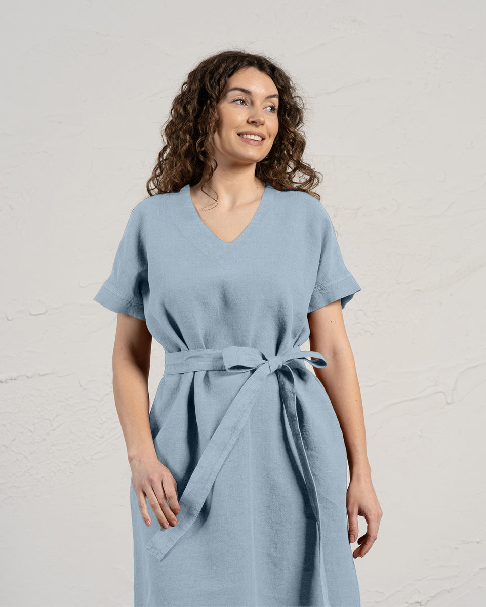 Joelle-klänningen är gjord av 100% linne, med en smickrande V-ringning, en avslappnad och rymlig silhuett samt midi-längd som förlänger din figur så att du ser längre och smalare ut. Linnetunikan har också ett knytbälte som kan markera din midja. Den flödande linnéklänningen har två dolda innerfickor som är perfekta för att förvara småsaker eller bara ett perfekt ställe att lägga händerna på.