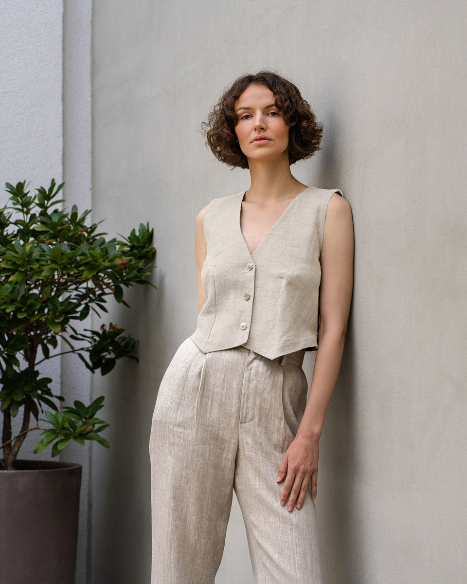 Klassisk men ändå trendig linneoutfit – med den älskade 'Ava'-västen och 'Lotus'-byxorna med plisserade vida ben. Tillverkad av 100 % ekologiskt linne, är vår semi-formella outfit för kvinnor inte bara tidlös utan också mångsidig. Kombinera den med olika toppar, byxor och ytterplagg för en livstid av stilfulla looks.