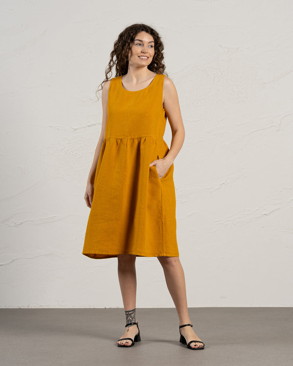 Eliza-klänning för kvinnor gjord av ett mjukt och luftigt 100% linne-tyg, midi-klänningen har en smickrande rund halsringning, en flödande fåll och en bedårande smock-fram. Ge din garderob en jordnära färg med vår linneklänning Eliza.