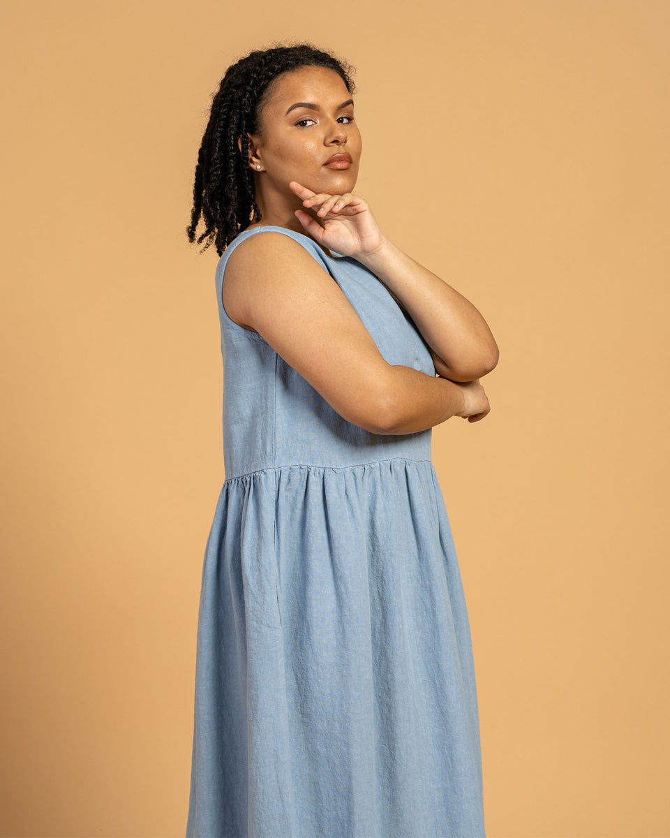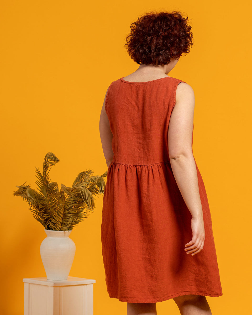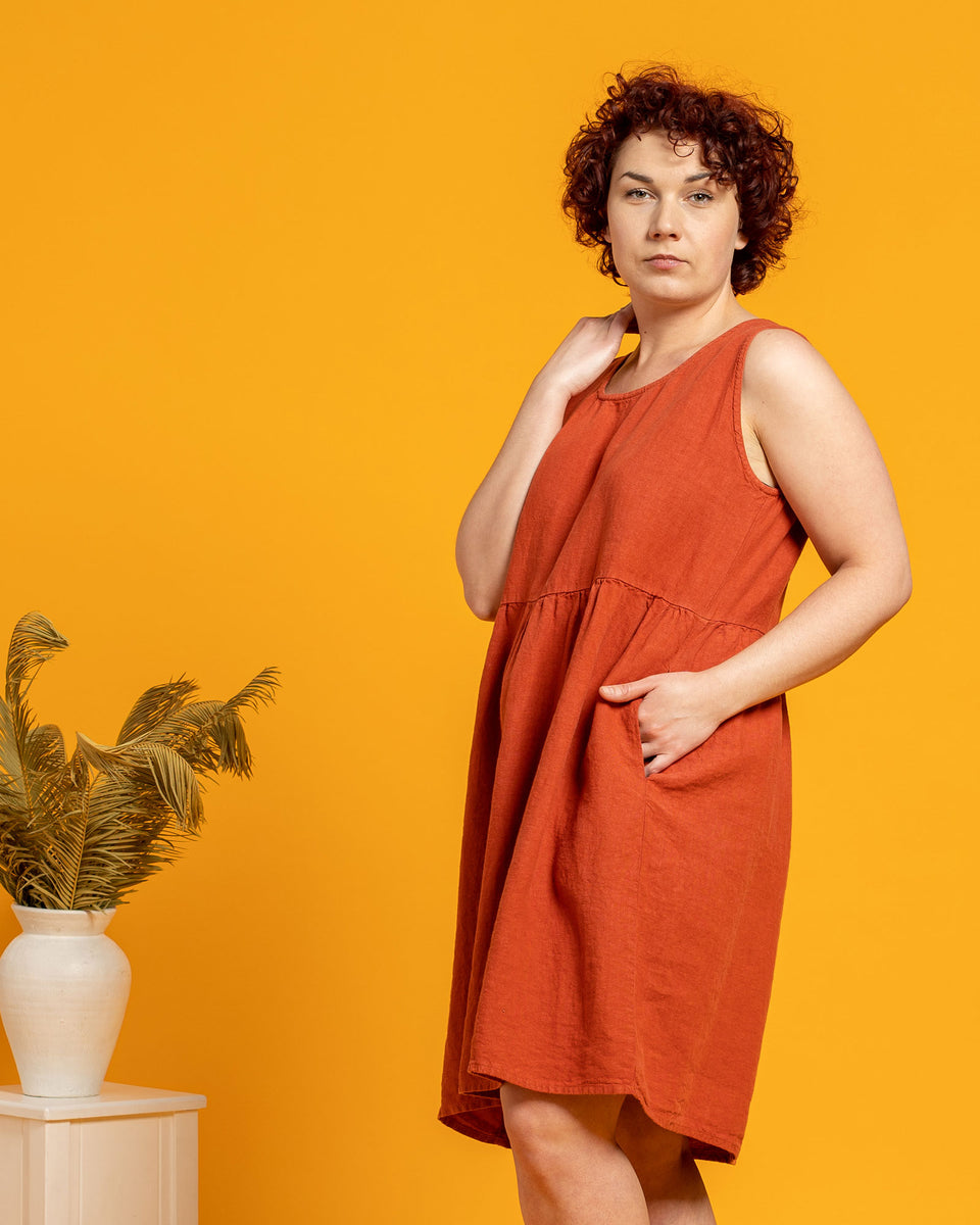 Oavsett om du planerar att äta utomhus, resa till stranden eller helt enkelt letar efter ett bekvämt alternativ att ha på jobbet under varma och fuktiga sommardagar – är Eliza-klänningen ett måste. Tillverkad av ett mjukt och luftigt 100% linne-tyg, har midi-klänningen alla funktioner en tjej kan önska, inklusive en smickrande rund halsringning, en flödande fåll och en bedårande smock-fram. Ge din garderob lite färg med vår kanelröda klänning Eliza. Byt sedan enkelt mellan klackar, stövlar och sneakers beroende på tillfället.