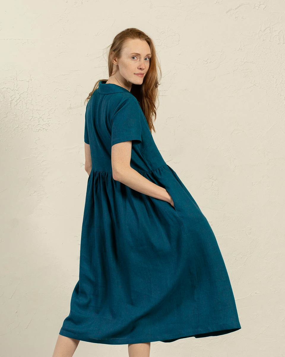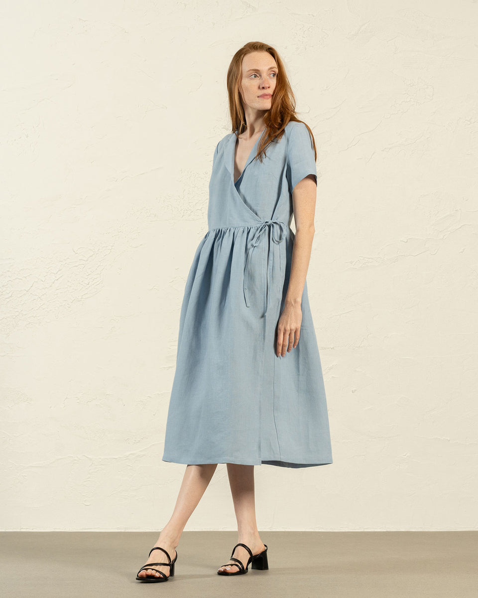 Linen shirt dress Phoebe – a midi dress for women with a collared neck, V-neckline, and delightful ruffles at the waist. Enjoy the comfort of short sleeves, a smocked waist, and the convenience of two side pockets. Wrap dress Phoebe is perfect for any occasion: either as an office outfit or a whimsical dress for vacation.