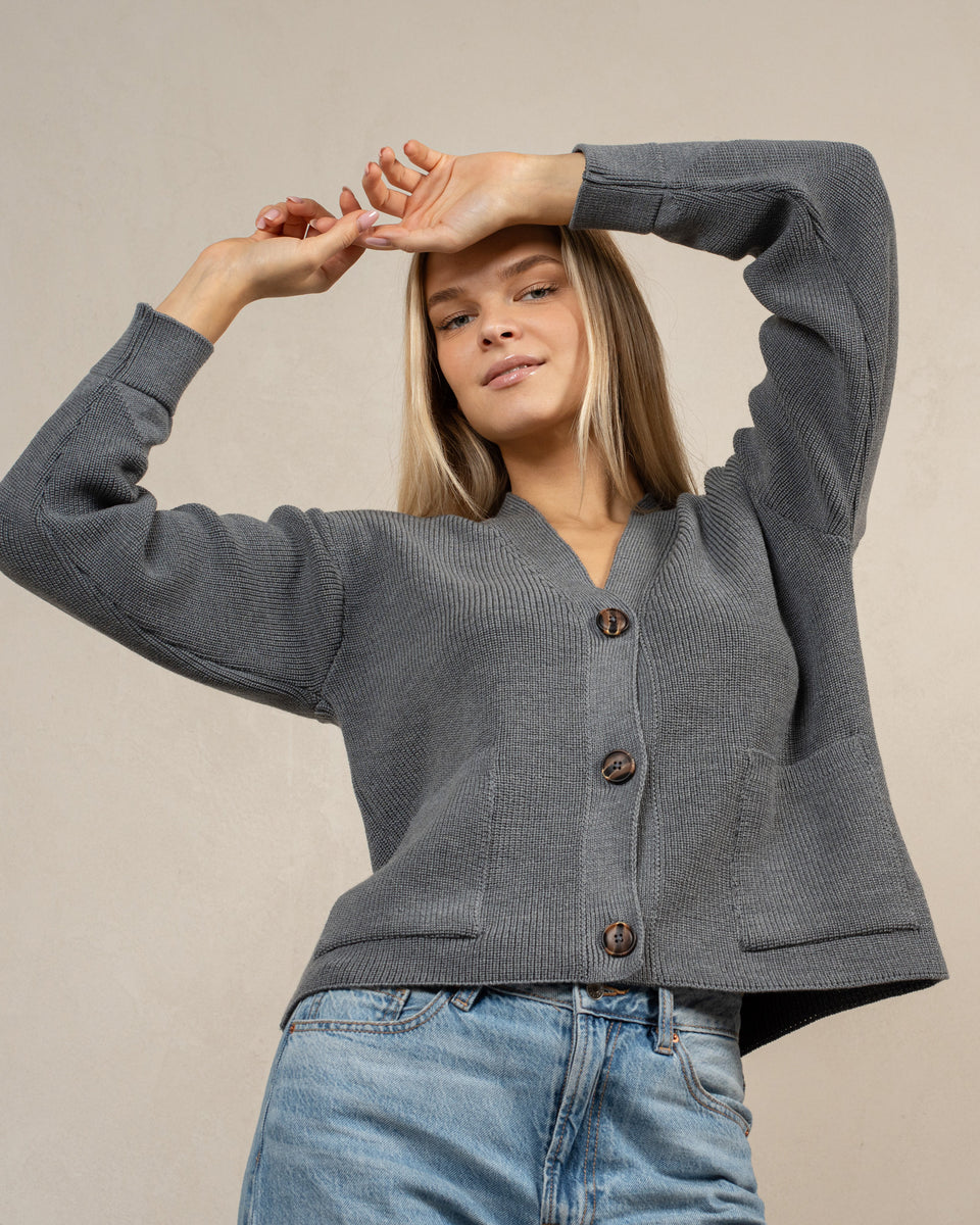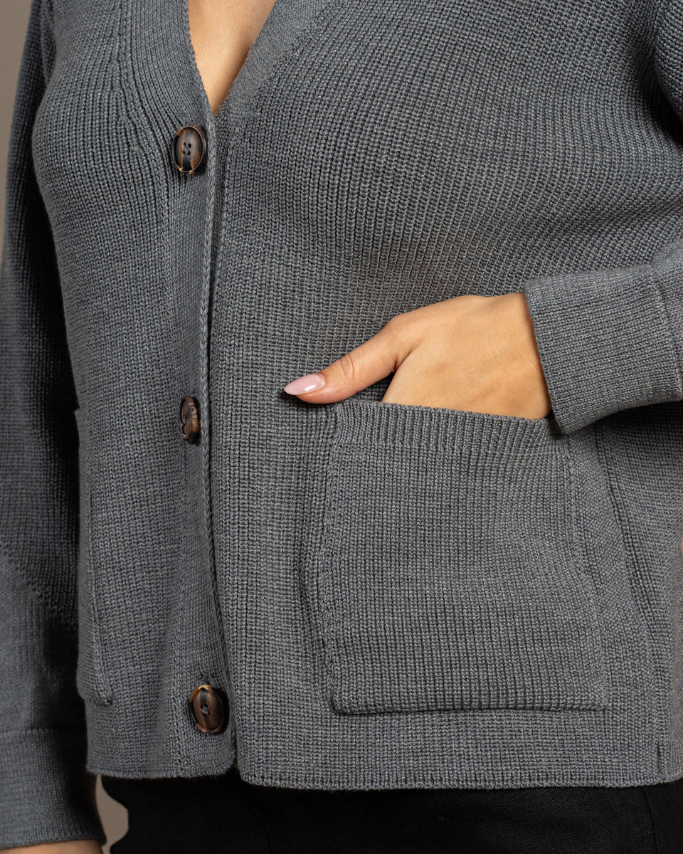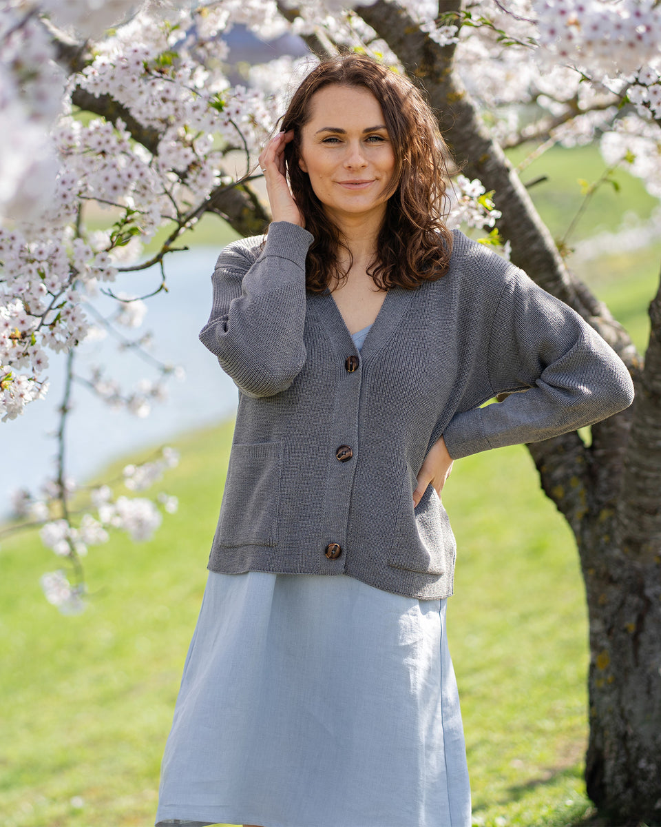 This versatile merino wool cardigan for women features a button closure, boxy fit, and practical pockets for style and functionality. Made from premium 100%  wool, it naturally regulates temperature, keeping you comfortable year-round. With ribbed cuffs and a triangular detail at the sleeves, it’s perfect for layering or wearing loose. Plus, enjoy matching with your little one in the mini-me version.