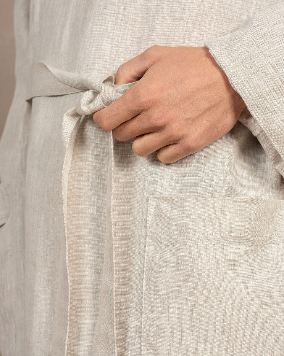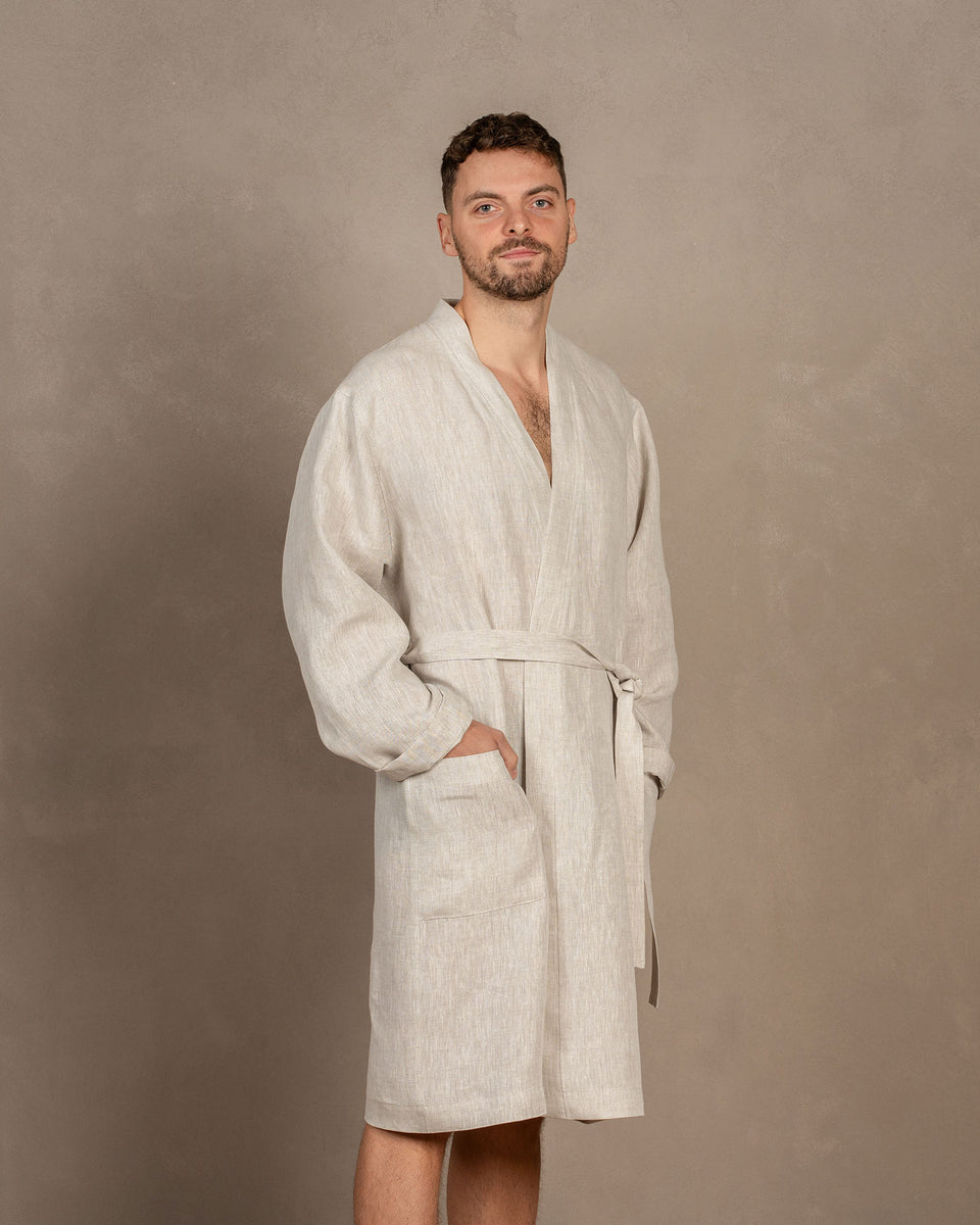 Upptäck den perfekta kombinationen av komfort och praktisk användning med 100 % linne badrock för män. Tillverkad av högkvalitativt linne, kombinerar denna korta rock mjukt, lätt material med en hållbar, robust känsla, perfekt för en sofistikerad, maskulin look. Den naturliga färgen och den minimalistiska designen ger en känsla av enkel stil, medan det miljövänliga naturliga linnetyget skapar ett elegant intryck. Andningsbar och absorberande, är denna linnrock designad för en avslappnad passform och enkel rörelse, vilket gör den idealisk för att koppla av efter duschen, slappa på helgerna eller lägga till en touch av elegans i din morgonrutin.