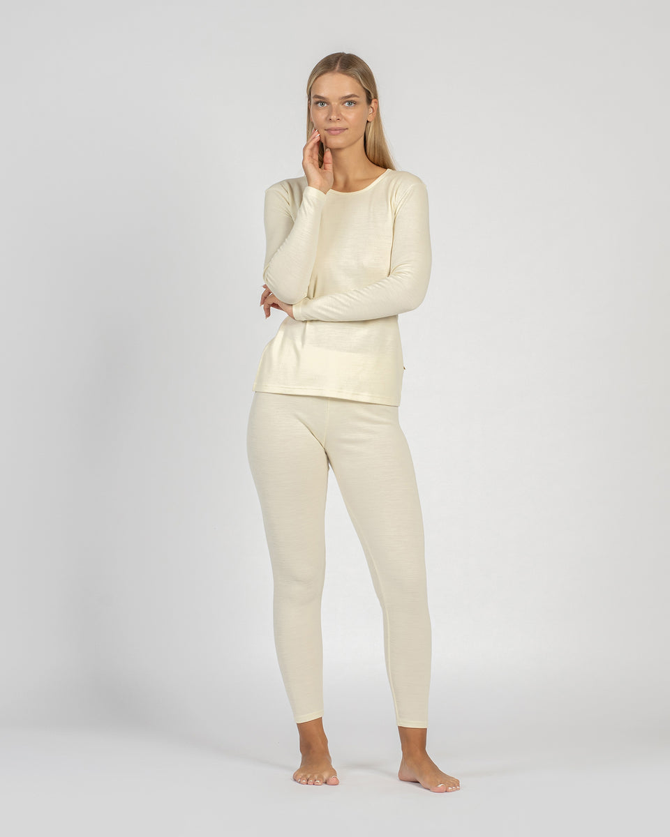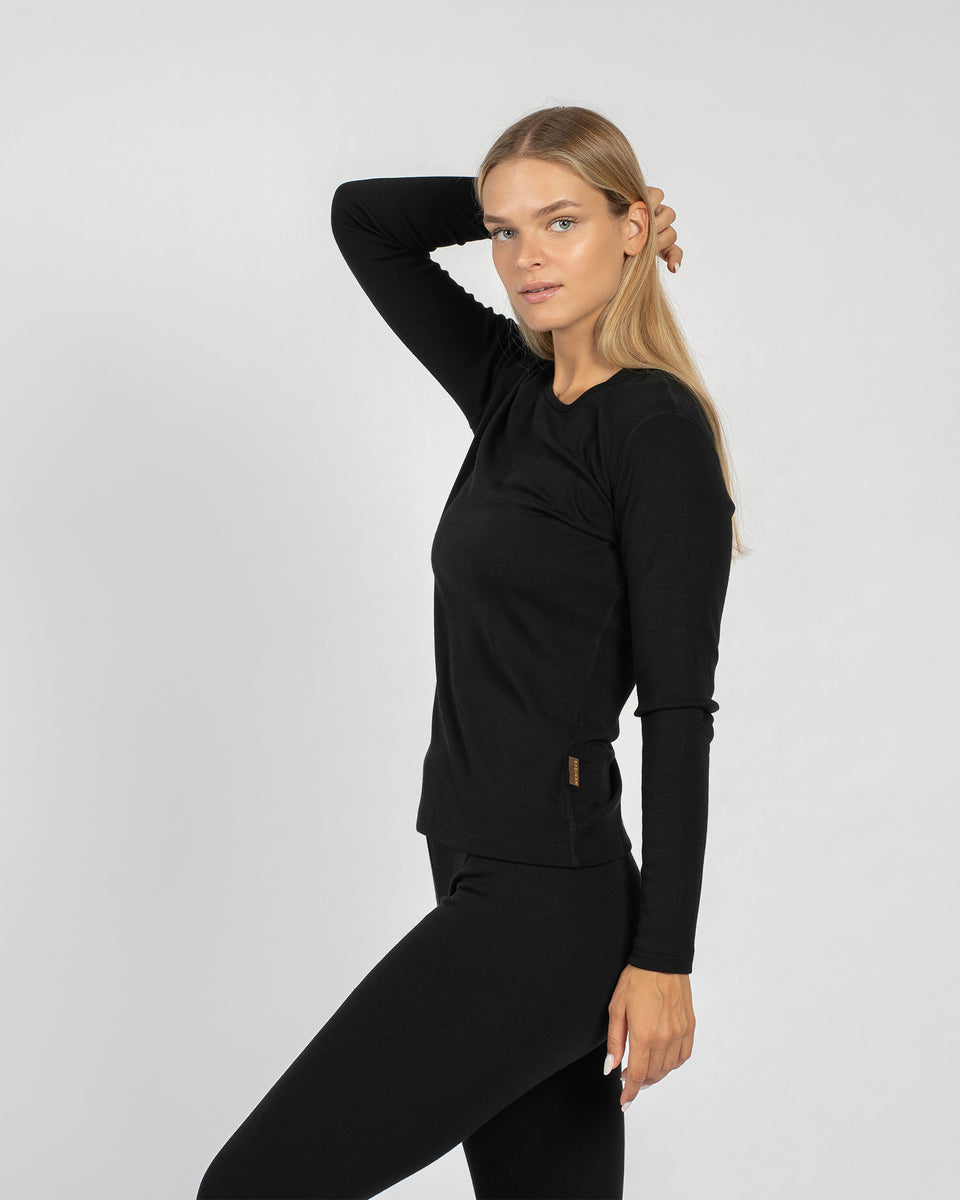 Letar du efter bra lagerplagg som ger lite värme och komfort i nästan alla situationer? Vårt set med långärmad sweatshirt med rund hals och matchande leggings i en klassisk svart färg är noggrant tillverkat av 100 % merinoull som är bekväm, funktionell och skonsam mot huden. Med fokus på rörlighet ser vi till att ditt vandringsset sitter på plats när du är på språng.