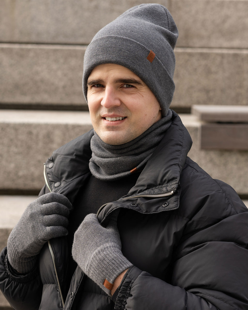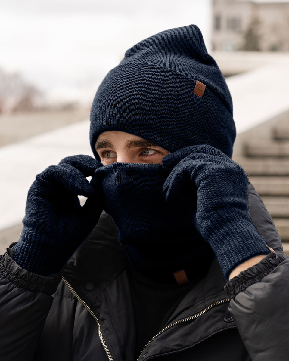 Börja din dag med vårt pålitliga set av stickade tillbehör för män. Med en stickad mössa, halsduk och handskar med fulla fingrar, är denna tre-delars kombination noggrant stickad av 100% Merinoullgarn. Dessa ullhandskar kan bäras när du hanterar snö i vardagen eller när du åker till en skidort – de kommer att klara av ditt arbete med lätthet oavsett var du är. Dessutom kan denna mock dickie döljas under skjortor eller jackor, vilket ger intrycket av att du har lager över en polotröja. Inte bara kommer denna polotröja att hålla din hals varm under kalla dagar, utan den kan också ge överlägsen värme utan att skapa extra bulk. Med denna kraftfulla kombination kommer du att känna dig varmt och miljömedvetet utan ansträngning.