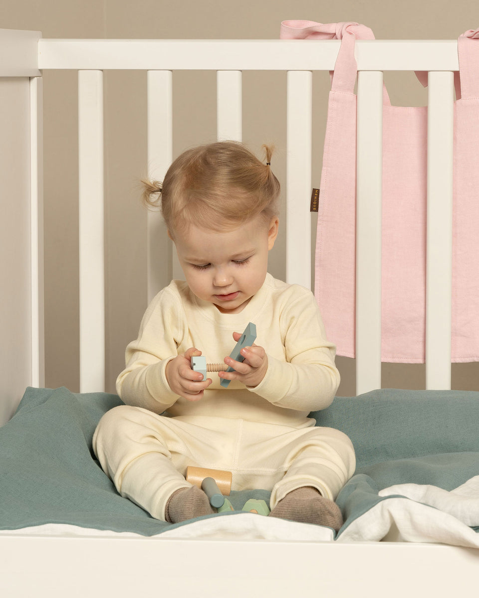Ett ekologiskt, hypoallergent och naturligt linnelakan för spjälsäng som är designat för att förbättra bebisars sömn med komfort och mjukhet. Detta dubbelsidiga påslakan har en kuvertstängning.