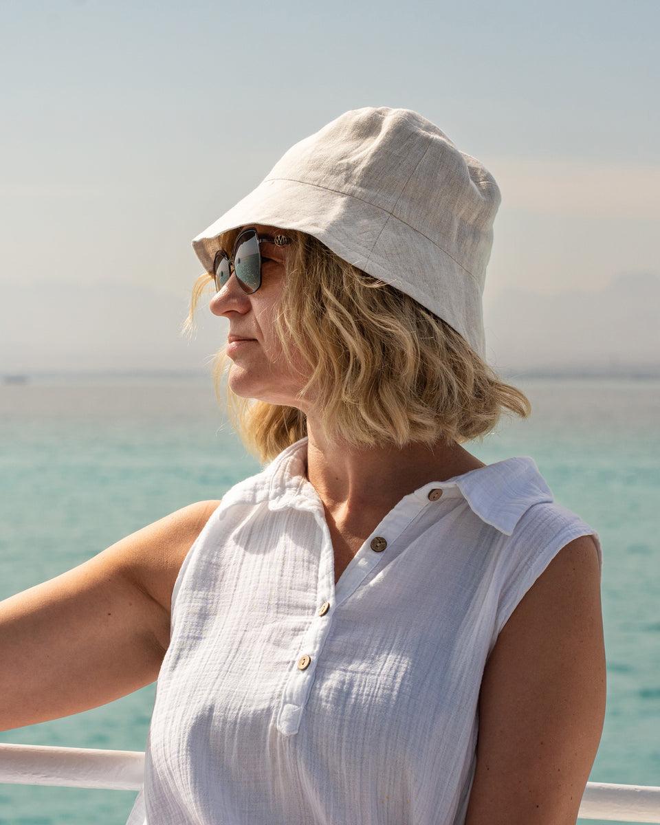 Hållbar och ekologisk linne-bucket hat, designad med din komfort i åtanke. Tillverkad av högkvalitativt, andningsbart linne, är det en idealisk sommarhatt för kvinnor. Ingen irritation, inget svett – bara en lättburen stil. Höj din look med en hatt som känns lika bra som den ser ut. Kombinera den med en luftig linne-sommardress eller din favoritbaddräkt för en trendig kustkänsla.