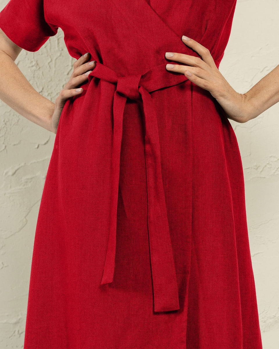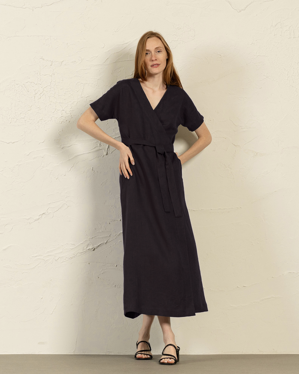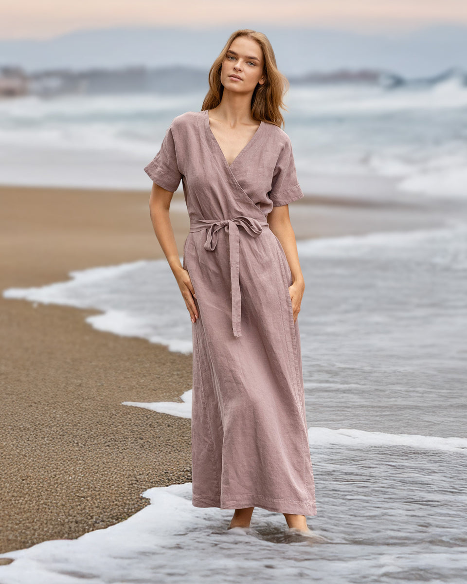 Hållbar sommarklänning gjord av 100% ekologisk linne med en unik omslagdesign. Med en elegant V-ringning, kimonoärmar och ett knytbälte som definierar din midja, kommer din nya maxiklänning att vara perfekt för många tillfällen. En linne maxiklänning för kvinnor är perfekt för en bröllopsgästlook.