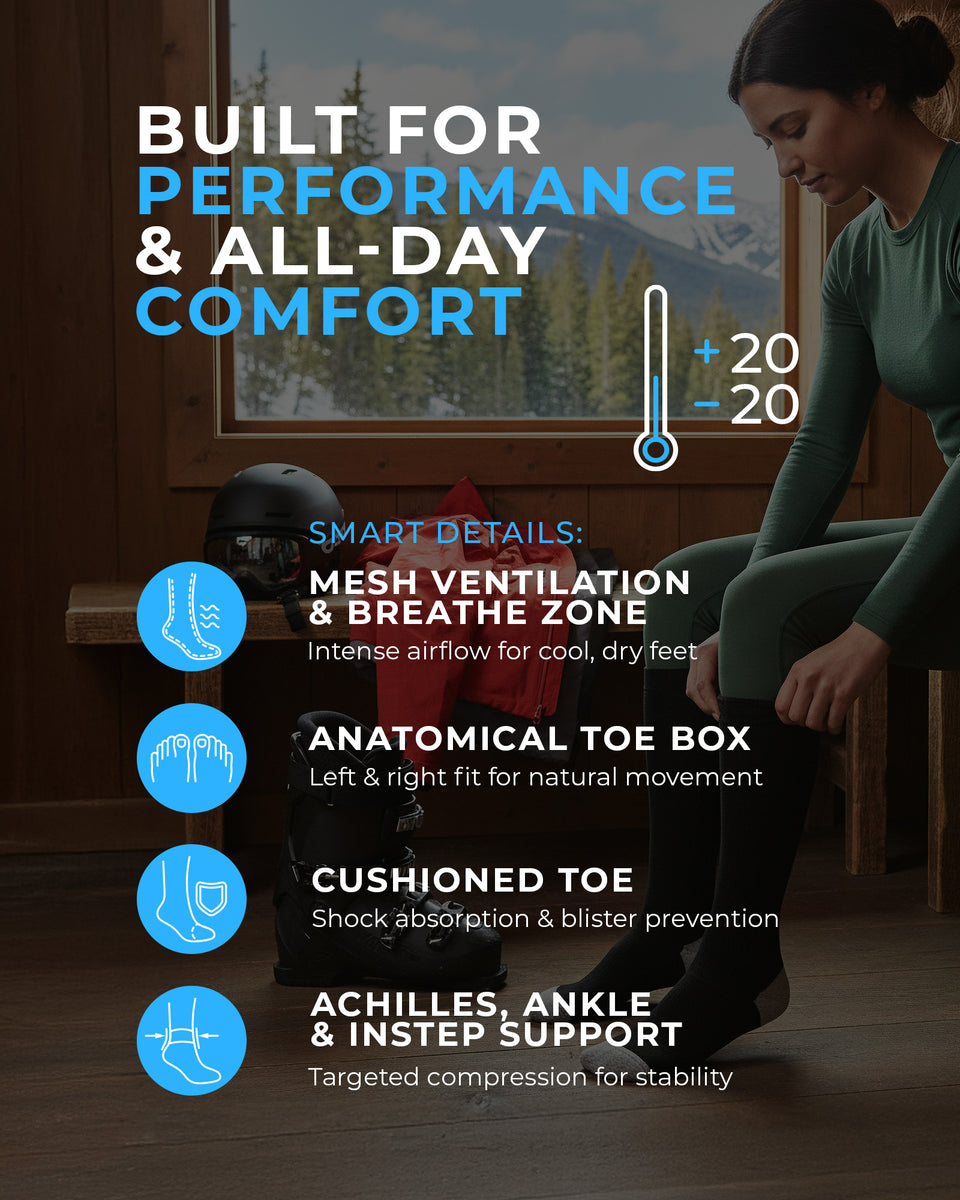 Möt dina vinteräventyr med damernas termiska skidstrumpor, gjorda av en lyxig blandning av Merinoull. Designade för att stödja dig från första liften till sista åket, erbjuder dessa prestandastrumpor den perfekta balansen mellan mjukhet, värme och andningsförmåga – idealiska för skidåkning, snowboard, vandring eller att helt enkelt njuta av kylan med komfort. Merinoullens naturliga temperaturreglerande och fuktavvisande egenskaper håller dina fötter varma och torra utan att bli för varma, medan ullstrumpornas silkeslena känsla är skonsam mot huden, även efter timmar i dina pjäxor.Njut av extra komfort med extra vaddering, som gör dessa funktionella strumpor kraftfulla i prestanda och redo för bergen – det här är de långa strumporna som din vintergarderob har väntat på!