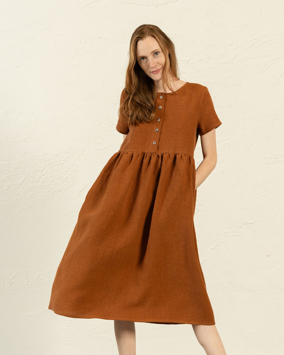 Maria-klänningen har en avslappnad och rymlig passform, denna klänning i 100 % linne kombinerar den runda halsringningen, två dolda fickor och insydda korta ärmar. Dessutom möjliggör en funktionell knappslå framtill enkel amning, så den är lämplig för ammande mödrar.